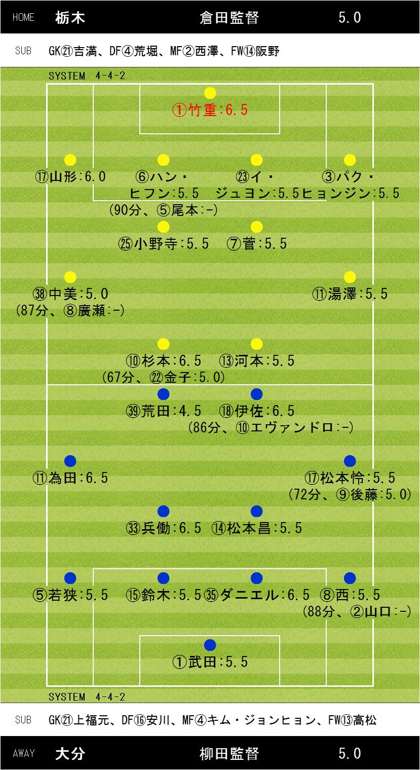 1−1【14分:杉本(栃木)、28分:伊佐(大分)】