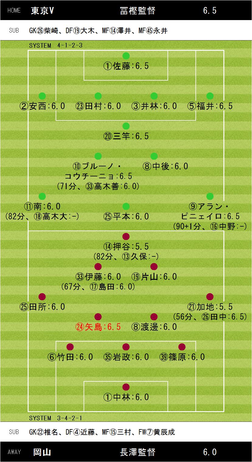 1−1【29分:矢島(岡山)、49分:オウンゴール(東京V)】