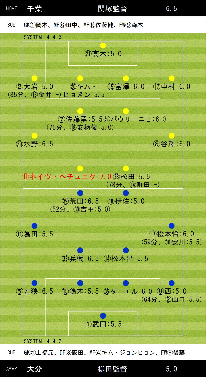 2−2【21分:荒田(大分)、35分:若狭(大分)、55分:ネイツ・ペチュニク(千葉)、90+2分:ネイツ・ペチュニク(千葉)】
