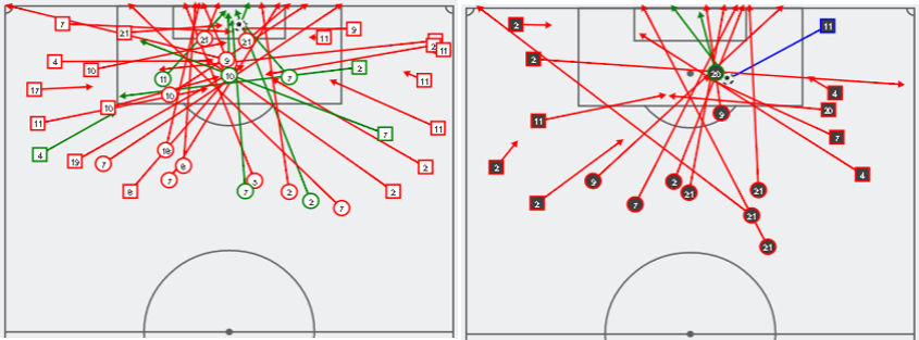 一方それぞれ30%弱を占めるゴール前の攻防をイラストで見てみよう。