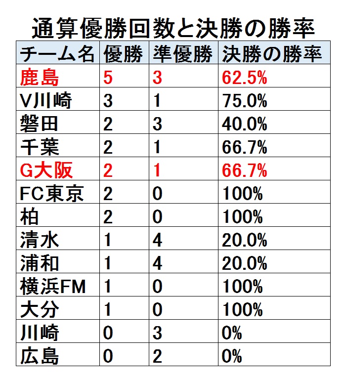 [3]6度目の優勝を狙う鹿島 決勝の勝率は62.5%