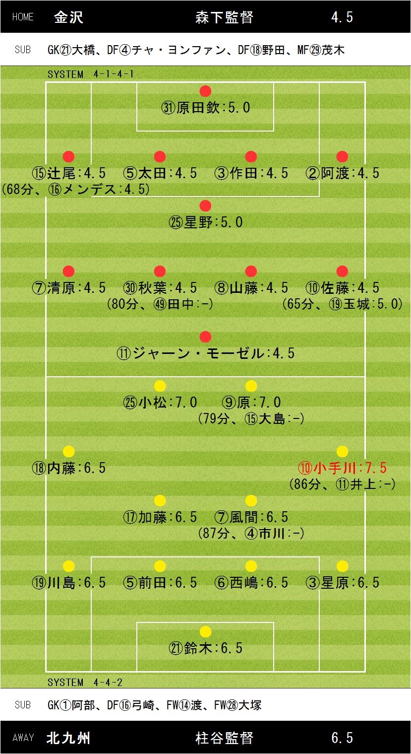 0−4【18分:小手川(北九州)、46分:小手川(北九州)、61分:小松(北九州)、85分:小手川(北九州)】