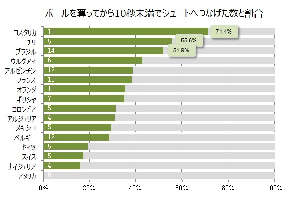 また、表中にはないが、アタッキングサードでタックルをした回数を90分換算した値で見ると、3.9回のアルゼンチンを筆頭に、ブラジル、ドイツ、オランダと続く。また、表2にはボールを奪ってから10秒未満でシュートへつなげた数と割合を示した。シュートへつなげた数が多いのは、ブラジル、アルゼンチン、フランスと、表1の上位と同じ国が並んでいるのだ。