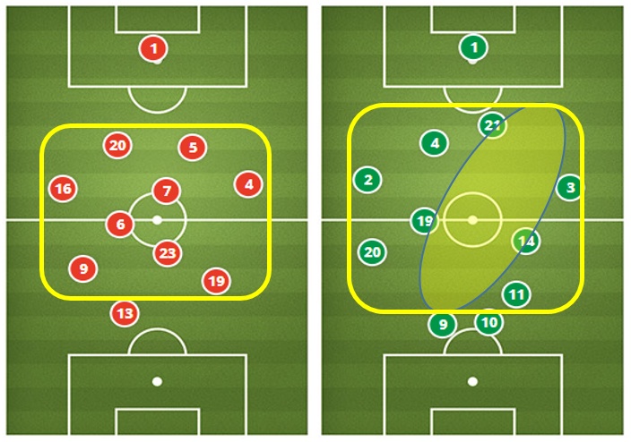 さらにコンパクトさの中で各選手の立ち位置のバランスを見るとフランスの方は大きなギャップがあるのが分かる。フランスはドイツのコンパクトな陣形に入る込むことが出来ず裏を狙う攻撃を多用したが、一方のドイツは奪ったボールを中央付近で前向きにボールを持つことが多かった。それは「一体感」はあるが「コレクティブ」ではなかったフランスの組織のギャップを突けたからだ。