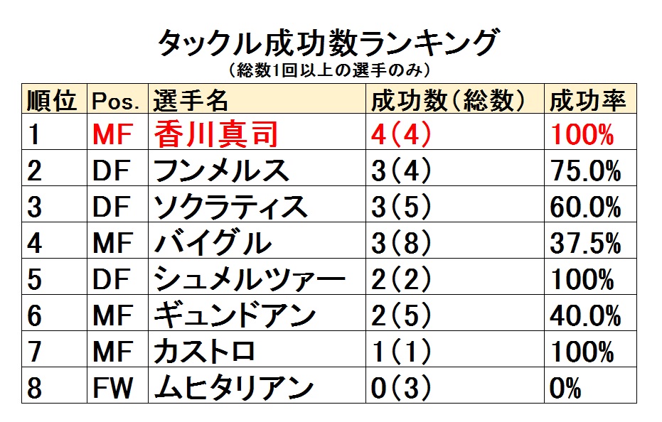 この試合で香川は、相手のボールホルダーにタックルを4度試みてすべて成功。100パーセントという確率はもちろん、[DATA-1]のとおりタックルの成功回数4回もチームトップの数字となっている。