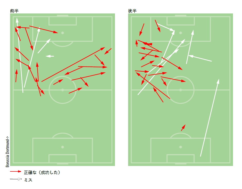 [DATA-3]香川のパス方向を前後半で示したもの。ドルトムントが攻勢を仕掛けた前半は積極的な配球が目立った