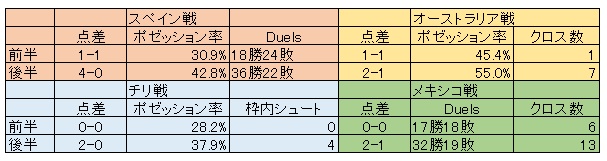 まずは最初の表を見てほしい。オランダの決勝トーナメント1回戦までの4試合の前後半の数値だ。