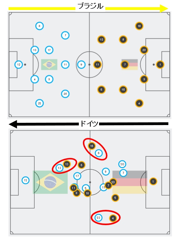 このイラストは上がスタート時のフォーメーション、下がこの試合の先発メンバーの平均ポジションだ。ドイツは右サイドバックのDFフィリップ・ラームが攻撃参加するために高い位置にいる。ミュラーとMFメスト・エジルが内側にいるのは前線での積極的なポジションチェンジの結果だ。このフォーメーションのマッチングではドイツの3トップに対し、ブラジルは4バックでの対応が基本となるはずだ。だが、両サイドバック同士がマッチングする機会が多くなり、必然とエジルとミュラーのマークが浮く結果に。ミュラーにはダンテが対応していることになるが、エジルは恒常的にフリーな状態になっている。そうして次から次へと「ずれ」が生じた結果、ブラジルは自陣に湧き出てくるドイツの選手への対応が追い付かなくなってしまったというわけだ。