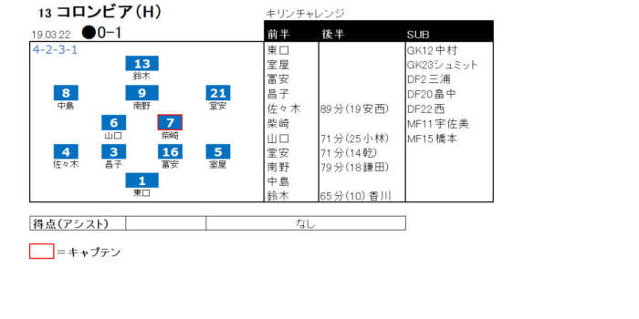 2019年3月22日 キリンチャレンジ コロンビア戦(●0-1)