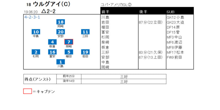 2019年6月20日 コパ・アメリカ グループリーグ第2節 ウルグアイ戦(△2-2)