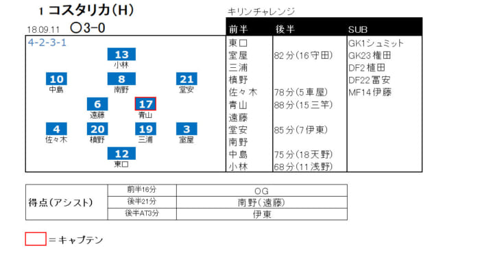2018年9月11日 キリンチャレンジ コスタリカ戦(〇3-0)