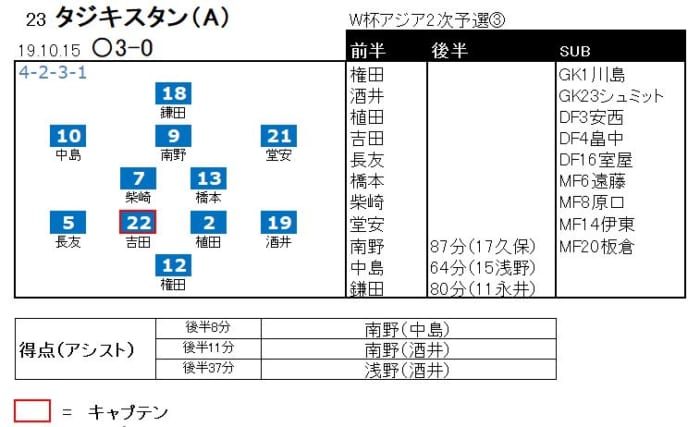 2019年10月15日 W杯アジア2次予選 グループF③ タジキスタン戦 (〇3-0)