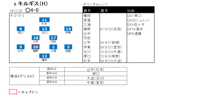2018年11月20日 キリンチャレンジ キルギス戦(〇4-0)