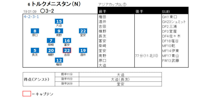 2019年1月9日 アジアカップ グループリーグ第1節 トルクメニスタン戦(〇3-2)