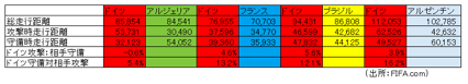 この表はドイツと対戦相手のインプレー時の走行距離だ。全ての試合でドイツが相手より「走って」いたのが一目でわかる。大事なのは相手より「いつ」多く走っていたかだ。これまでは守備時にはなるべく走らないように、攻撃時に一気にパワーをかけるという考え方が一般的だった。今回のドイツはポゼッション率が高かったためそもそもマイボール時に多くの距離を走っていた。それはアルジェリア戦を除いた全試合で相手の守備者より長い距離を走っていた。しかし相手がボールを保持すると、その相手よりも10%以上多く走っていたのが分かる。