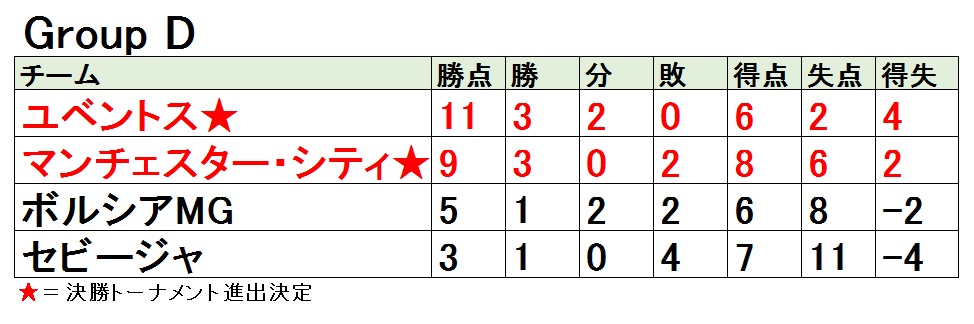 ユベントス、マンチェスター・シティの16強進出が確定。現段階でプレミア勢唯一の決勝トーナメント進出を決めているシティだが、首位通過のためには勝利が最低条件で、ユベントスがセビージャに敗れた場合のみ可能性が残されている。3位争いの行方はボルシアMGがリードする。EL2連覇中のセビージャだが、勝利、かつボルシアMG敗戦しか望みはない。
