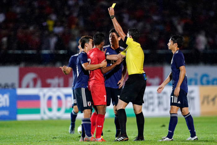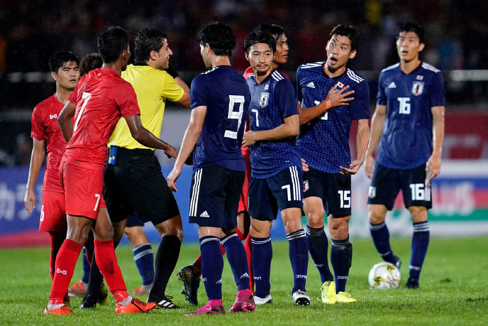 【写真】日本代表FW大迫、ミャンマーDFの背後からの“危険タックル”に怒り露わ