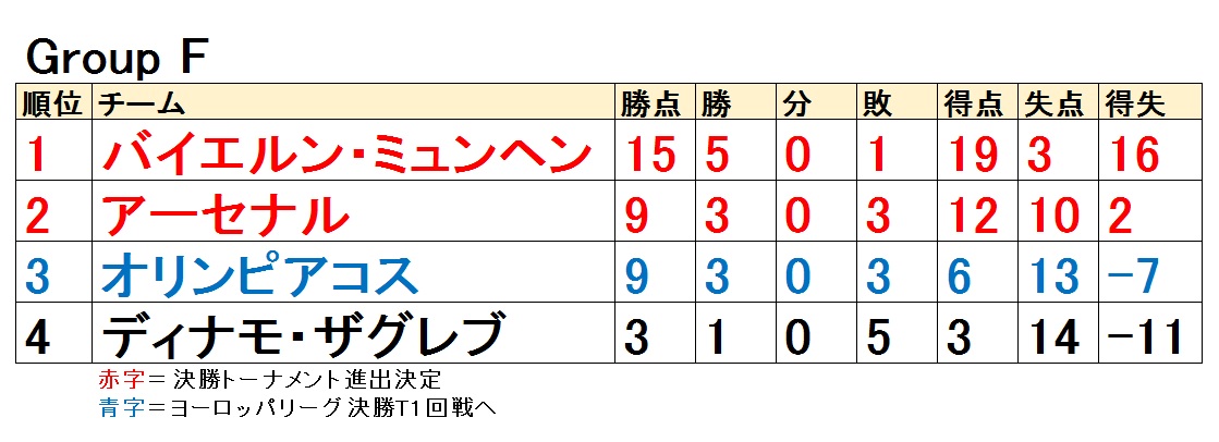 バイエルン・ミュンヘンの首位通過が決まっていたため、注目はオリンピアコスとアーセナルの2位争いに絞られていた。ホームで2-3と敗れていた直接対決の成績を上回る勝利が求められていたアーセナルは、フランス代表FWオリビエ・ジルーのハットトリックの活躍により3-0と快勝。勝ち点9で並び、直接対決の成績で上回って奇跡の大逆転で2位の座を確保し、16シーズン連続となる16強進出を決めた。アーセナルはディナモ・ザグレブとの初戦など2連敗スタートが最後まで尾を引いたが、本拠地バイエルン戦での2−0勝利で勢いを取り戻し、最終的な突破を引き寄せた。