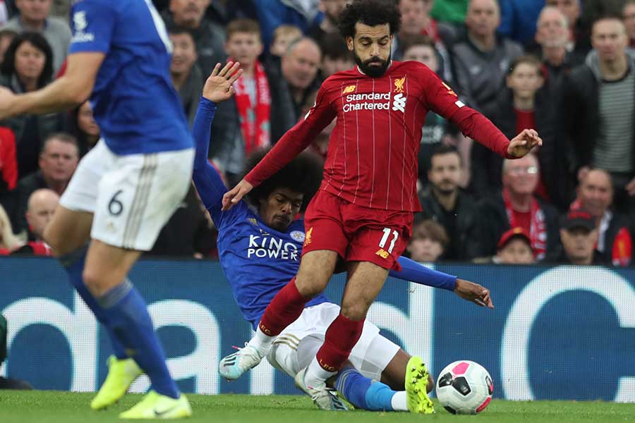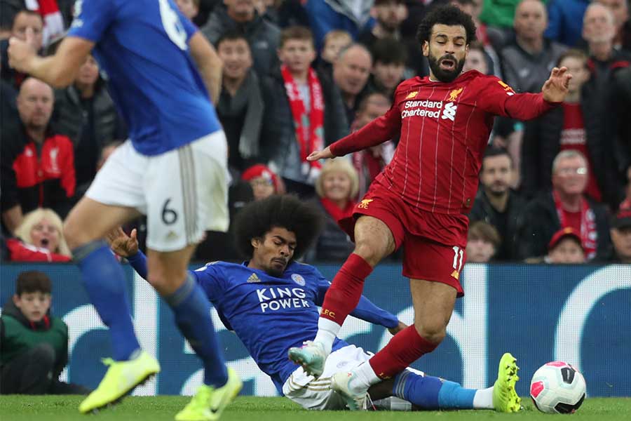 サラーが背後からチョードリーに危険なタックルを受けた瞬間【写真:AP & Getty Images】