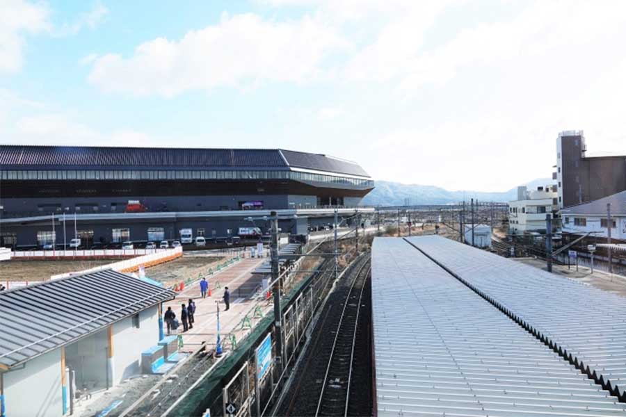 • JR亀岡駅から見えるサンガスタジアム。山の稜線に馴染む外観デザインになっている【写真:Noriko NAGANO】
