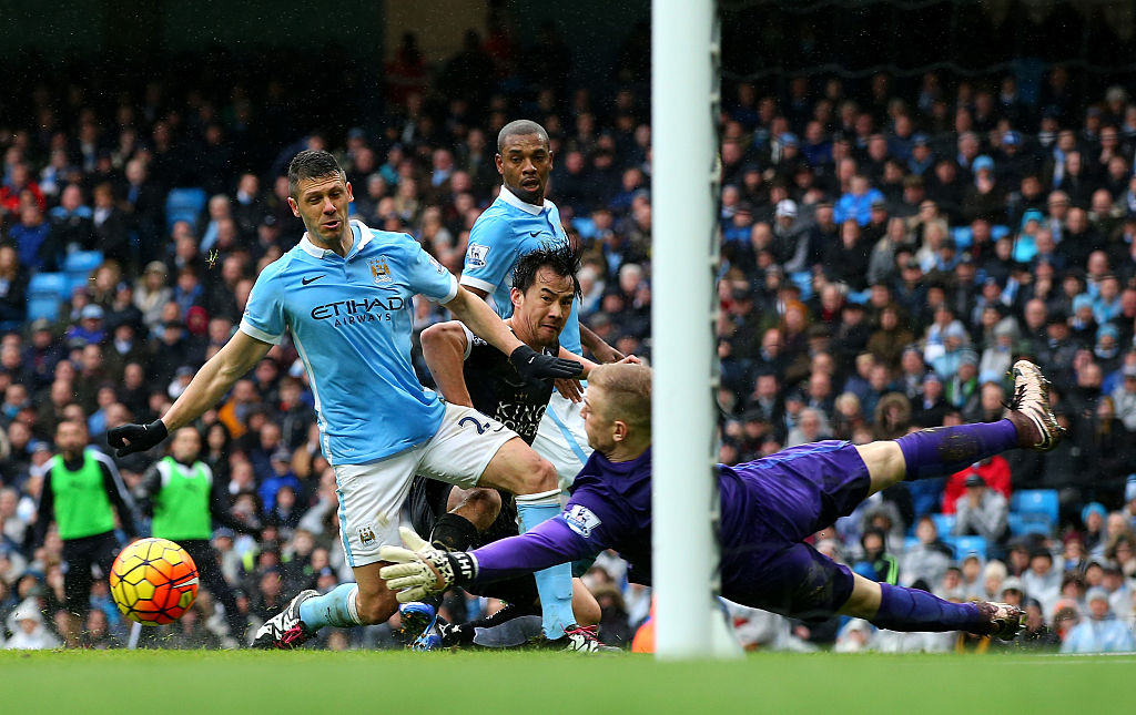 その後はホームのシティがポゼッションを高めて攻撃し、レスターがカウンターを仕掛ける構図でゲームが進んだ。レスター陣内に何度も侵入したシティだが、レスター守備陣が踏ん張り失点をせずに耐えた。逆にレスターは鋭いカウンターで、ロングボールにFWジェイミー・ヴァーディが抜け出す形や、再度からのボールにFW岡崎が飛び込む形でチャンスを作った。前半は1-0とレスターがリードして折り返した。