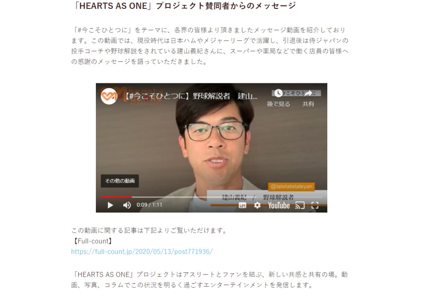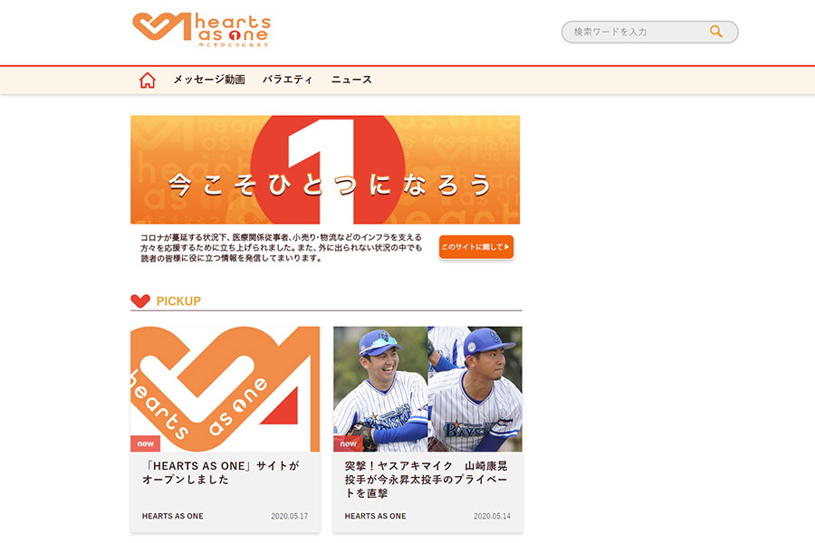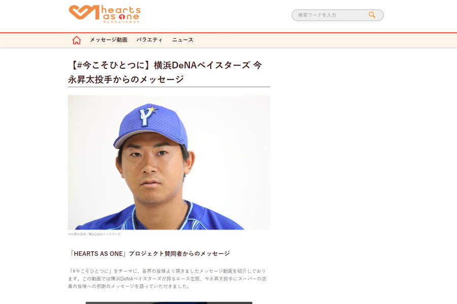 同サイトは「メッセージ動画」「バラエティ」「ニュース」の3つのカテゴリーで構成。「メッセージ動画」のコーナーでは「#今こそひとつに」を合言葉に、アスリートや著名人が医療従事者、エッセンシャルワーカーへの感謝の気持ちと言葉を送る。すでに開設している公式YouTubeチャンネルでは、野球界からDeNA今永昇太投手、元巨人の篠塚和典氏、元オリックス監督の森脇浩司氏らの動画が公開されている。