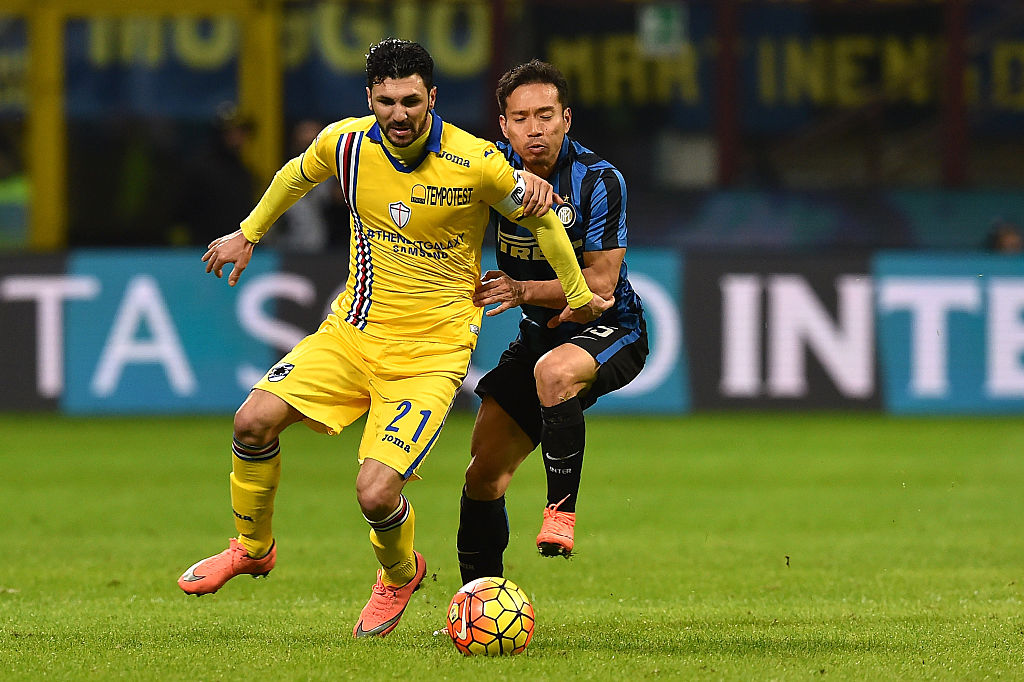 序盤はサンプドリアのペースでゲームが進んだが、GKサミル・ハンダノビッチの好守などでしのぐとインテルが反撃に出る。相手コーナーキックのこぼれ球を自陣で拾ったMFジョナサン・ビアビアニが長いドリブルで敵陣まで切り込み、右コーナーキックを得る。この場面で中央へのボールに両チームが競り合いファーサイドに流れたボールの先に待っていたのはDFダニーロ・ダンブロージオ。フリーの状態で押し込み、インテルが前半23分に先制点を挙げた。