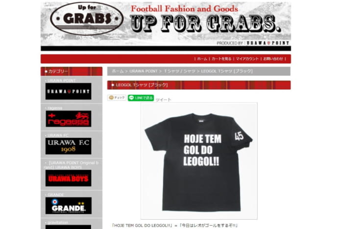浦和FWレオナルドの「今日はレオがゴールをするぞ!!」特製Tシャツ※「UP FOR GRABS.」公式サイトのスクリーンショットです。