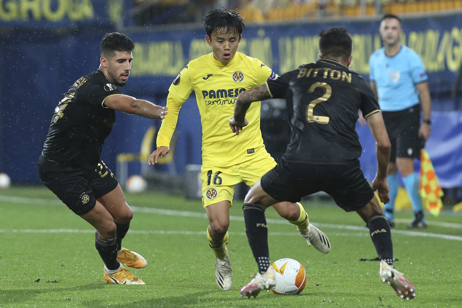 ビジャレアルのホームで行われた一戦は、試合開始前に豪雨でピッチが水浸しとなり、整備のためにキックオフが1時間後に変更となるアクシデント。それでも、EL3試合連続で先発に名を連ねた久保に影響はなく、4-3-3の右ウイングで攻撃を牽引していく。