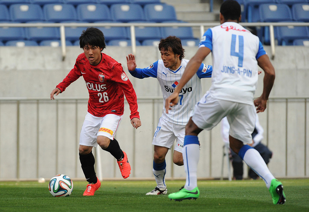 前半は立ち上がりから広州にペースを握られる時間が続いていたが、20分前後の時間帯で関根が縦に果敢なドリブル突破を仕掛けて2つのコーナーキックを獲得した。攻撃のセットプレーを得たことは後方の選手たちに一息を入れる余裕も与えたのだろう。次第に浦和がペースを奪い返した。