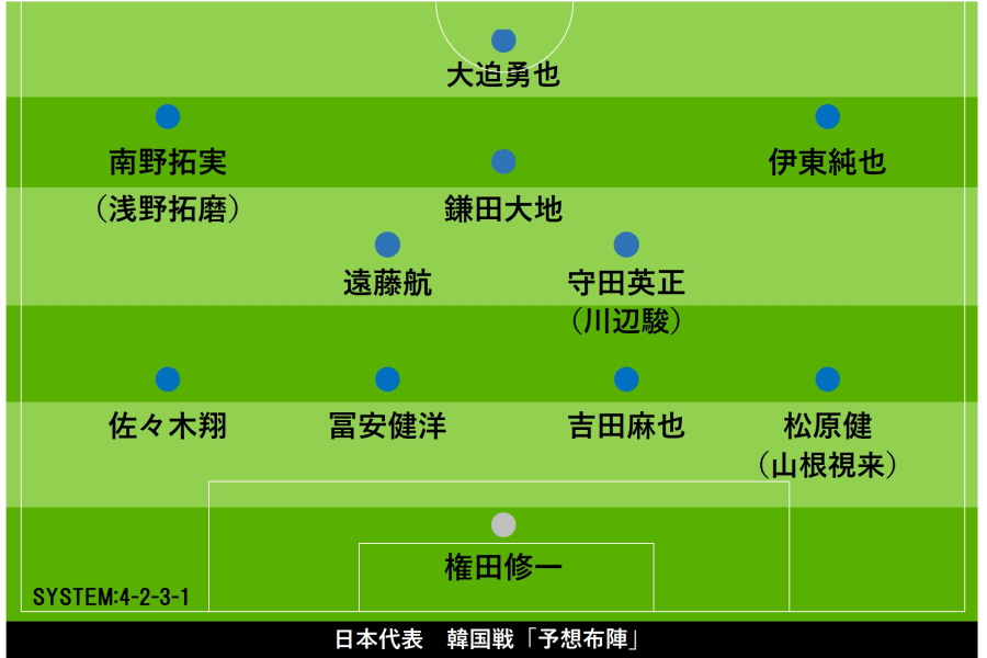 攻撃陣の中心はリオ五輪世代となりそうだ。右MFにクラブでも絶好調の伊東純也(ヘンク)、南野はクラブで務めている左MFでプレーし、トップ下に存在感を高めているMF鎌田大地(フランクフルト)が入れば、より円滑な連係が期待できる。南野がトップ下に入り、左MFにクラブで今季16ゴール挙げ、16年のU-23アジア選手権でU-23韓国代表相手に2得点したFW浅野拓磨(パルチザン)が俊足を生かしてゴールを狙うこともできる。