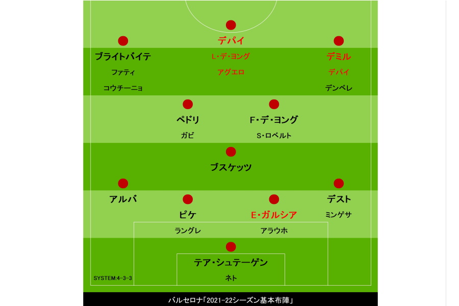 中盤ではMFペドリ、MFフレンキー・デ・ヨングと若い2人が主力として定着。その背後でキャプテンのMFセルヒオ・ブスケッツがバランスを取るレギュラー陣に不足はないが、バックアップが豊富かと言われればそうではない。出番のほとんどなかったボスニア・ヘルツェゴビナ代表MFミラレム・ピャニッチ(→ベシクタシュ)が退団し、カンテラ出身の逸材MFリキ・プッチはクーマン監督の構想外とも伝えられているなかで、ペドリに休養が与えられた第3節のヘタフェ戦(2-1)では17歳のMFガビことペドロ・パエスに出番が与えられた。新たなカンテラーノの台頭は朗報だが、今後も継続してプレーできるかは未知数だろう。燻ぶり続けるブラジル代表MFフィリペ・コウチーニョの復活にも期待したい。