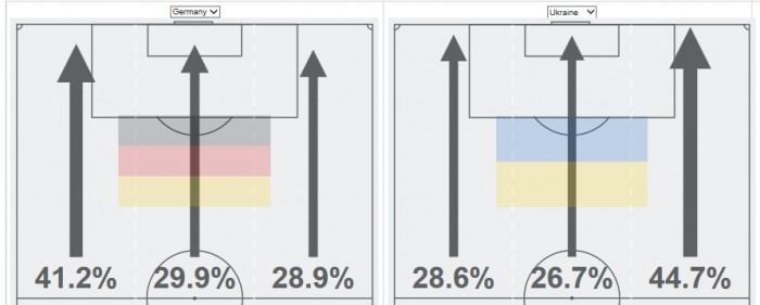 両チームともに、得意なサイドはあるものの、ある程度中央での攻撃の比率が高い。ドイツは右サイドよりも中央の方がわずかに多く、全体の約3分の1の攻撃はだ。中央の堅牢な守備網に対応するための施策の一つがサイド攻撃で、最初からサイドに限定する必要はない。そういう意味でドイツのバランスの良さが見て取れる。