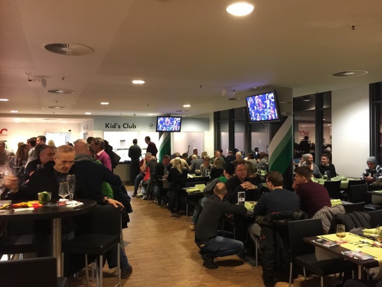 試合開始30分前の光景。ピッチでは選手がウォームアップをしているが、VIPエリアでは多くの人が会食を楽しんでいる。他のスタジアムでもそうだったが、この時期はまだまだ寒さが厳しいこともあってほとんどの人はキックオフ直前までラウンジにこもっていた。