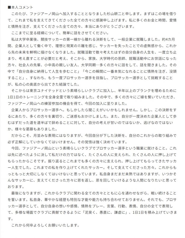 【画像】早稲田大卒業→就職→地域リーグ→J2クラブの異色キャリア! DF杉山耕二が岡山加入時に発表した渾身「1330文字」メッセージ