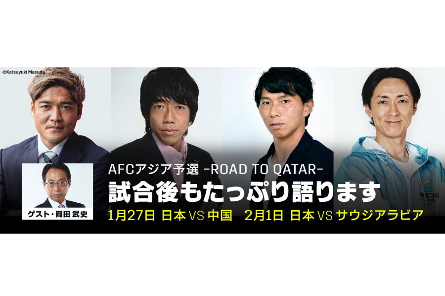 現在、グループ2位でW杯出場圏内ながら、3位の強豪オーストラリアと勝ち点1差の日本。対戦する中国には第2節のアウェーで1-0と勝利したものの、ホームでの一戦は多くの得点を奪って勝利したいところ。解説に元日本代表MF中村憲剛氏、ゲストには元日本代表FW大久保嘉人氏を迎え、かつて川崎フロンターレでチームメイトだった両者の掛け合いにも注目だ。