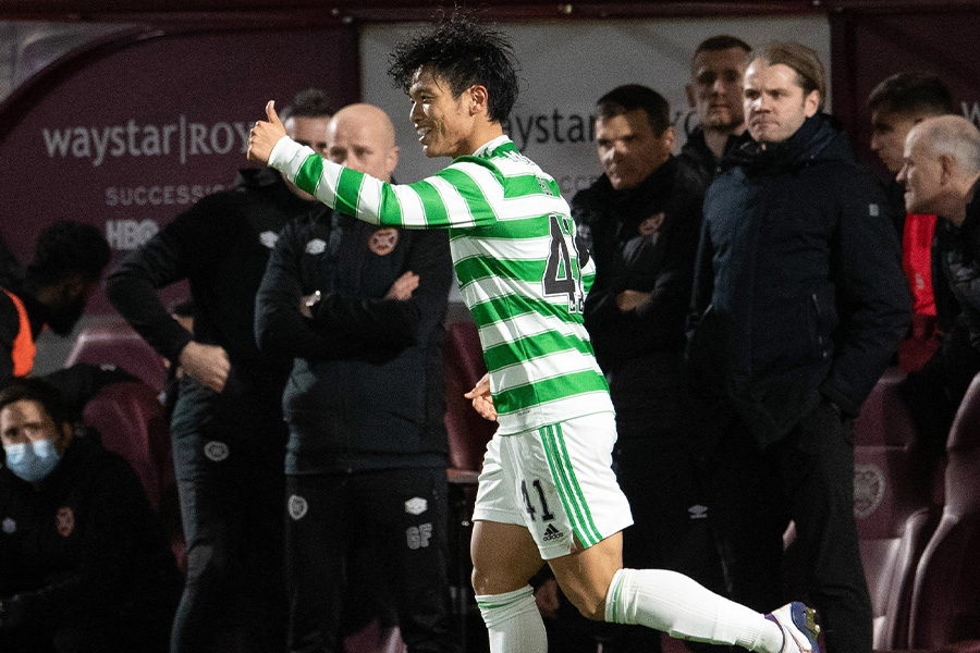 スコットランド1部セルティックのMF旗手怜央は、現地時間1月26日に行われたスコティッシュ・プレミアリーグ第23節の敵地ハーツ戦(2-1)に先発出場し、前半27分に強烈なミドルシュートで移籍後初ゴールを決めた。マン・オブ・ザ・マッチに選ばれたデビュー戦に続く活躍で、地元紙「スコティッシュ・デイリー・エクスプレス」の採点ではチームトップタイの9点が付く高評価となった。
