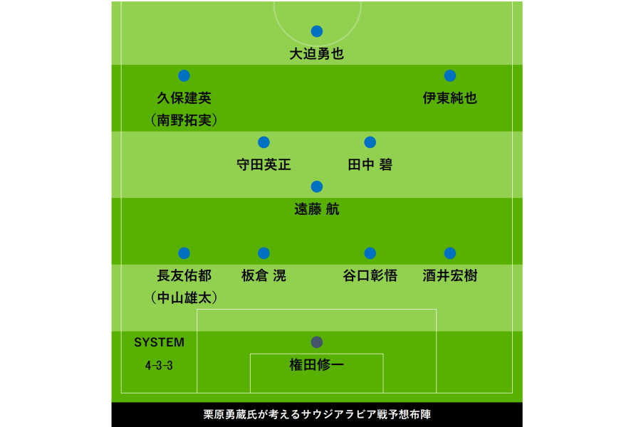 また、アンカーにMF遠藤航(シュツットガルト)、インサイドハーフにMF田中碧(デュッセルドルフ)、MF守田英正(サンタ・クララ)とボランチ3枚を配置した中盤は、中国戦だけでなく、ゲームで主導権を握るうえで重要な役割を担っている。強豪サウジアラビアとの対戦では、この中盤トリオと、攻撃の切り札であるMF伊東純也(ヘンク)は代えられないと栗原氏は語る。