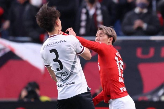 【写真】「赤やろ普通に」「明本それはだめや…」と反響 直後にレッドカード…浦和FW明本考浩が神戸DF小林友希の喉元に手を出して押し倒した瞬間