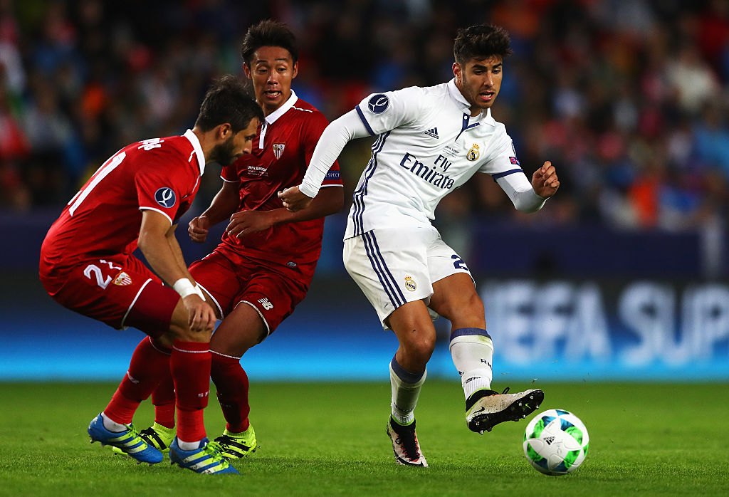 昨季のUEFAチャンピオンズリーグ王者レアルと、UEFAヨーロッパリーグ優勝のセビージャのスペイン勢対決で、UEFA公式サイトの予想スタメンではベンチスタートとなっていた清武だが、サンパオリ新監督は4-3-3システムの右ウイングで先発起用した。一方、ジダン監督率いるレアルは「BBCトリオ」のうちFWベイル、FWロナウドを欠いたものの、最終ラインにはDFセルヒオ・ラモスやマルセロ、MFカゼミーロ、今季ユベントスから復帰したFWモラタらが先発に並んだ。