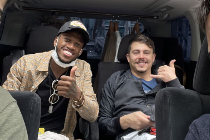 【写真】東京観光を楽しんだブラジル代表MFフレッジ、車内の様子【写真:関係者提供】