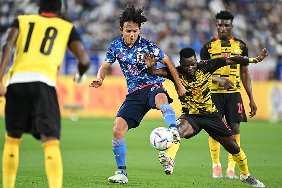 立ち上がりから主導権を握った日本は前半29分、DF山根視来が先制ゴールをマークすると、同点とされて迎えた同アディショナルタイムに、FW三笘薫が勝ち越しゴールを奪取。さらに後半28分、左サイドで三笘が縦に仕掛けてマイナスに入れたボールに久保が左足で合わせて、2019年6月9日の国際親善試合エルサルバドル戦でのデビューから約3年、17試合目にしてA代表での初得点をマークした。