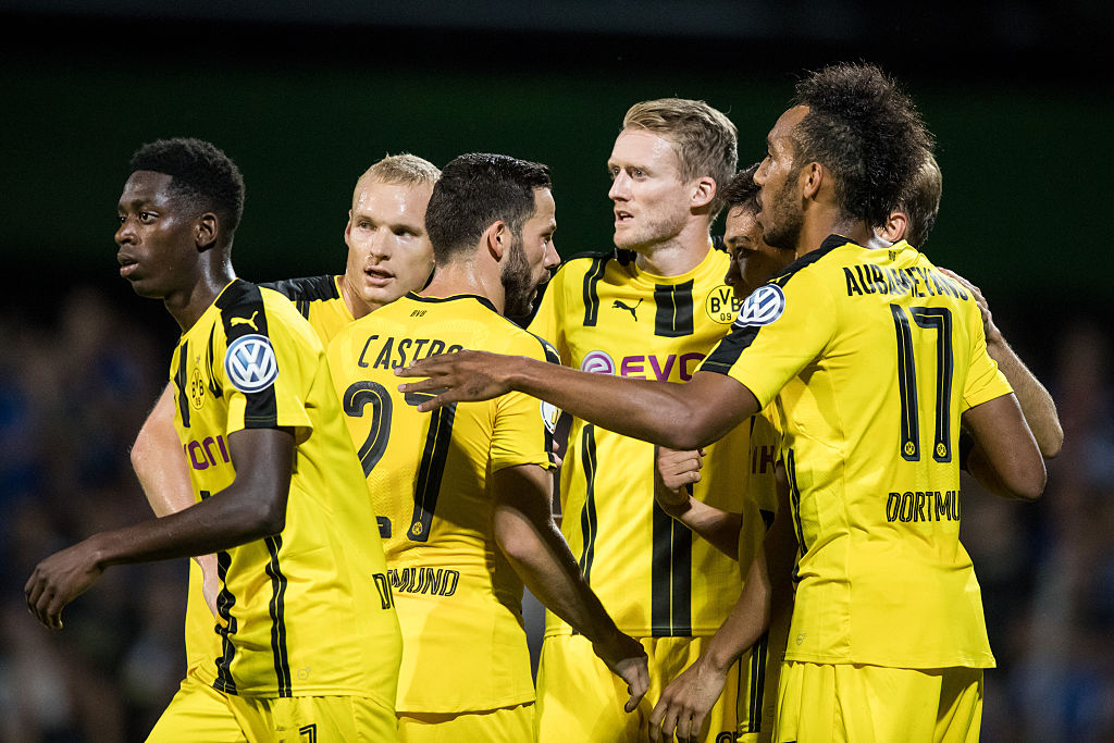 新戦力4人が先発したドルトムントは序盤から圧倒的にボールを支配し、サイド攻撃からゴールに迫っていく。前半17分、CKの流れから左サイドで香川のパスを受けたシュールレが右足に持ち替えて糸を引くようなクロスをファーサイドへ供給。これをFWオーバメヤンが走り込みながらヘディングでネットを揺らし、先制ゴールをゲット。昨季25得点で得点ランク2位となったエースの一撃でドルトムント幸先良く先制に成功した。