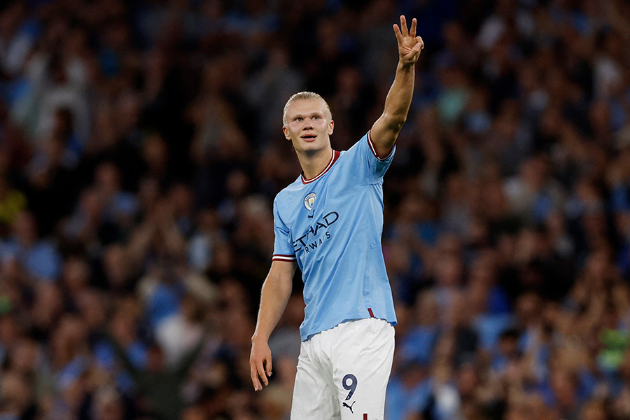 今夏にイングランド1部マンチェスター・シティに加入したノルウェー代表FWアーリング・ブラウト・ハーランドは、現地時間8月31日に行われたプレミアリーグ第5節ノッティンガム・フォレスト戦(6-0)で3得点を叩き出し、2試合連続ハットトリックとなった。開幕5試合で早くも二桁目前の9ゴールを重ねたストライカーの規格外の活躍ぶりを、海外メディアが大体的に報じている。