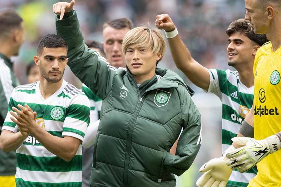 古橋の負傷状況が心配されたなか、セルティックはFWリエル・アバダの2ゴールなどで4-0と完勝を収めた。肩を釣った状況でベンチに退いてからも試合を見ていた古橋は、試合後の勝利のセレブレーションに参加して、サポーターと宿敵から挙げた勝利を喜んだ。