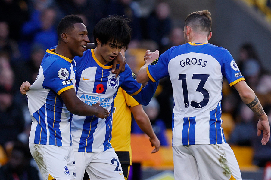 2試合連続スターティングイレブンに名を連ねた三笘は前半に右足アウトサイドを使ったパスで先制点の起点となると、1-2で迎えた同44分にはMFアダム・ララーナからの正確なクロスからヘディングで今季初ゴールをゲット。同アディショナルタイムには正確なボールタッチでDFネルソン・セメドの退場を誘発した。さらに後半38分には再び左サイドから仕掛けてエリア内を突破し、DFパスカル・グロスの決勝点を演出と獅子奮迅の活躍でチームを勝利に導いた。