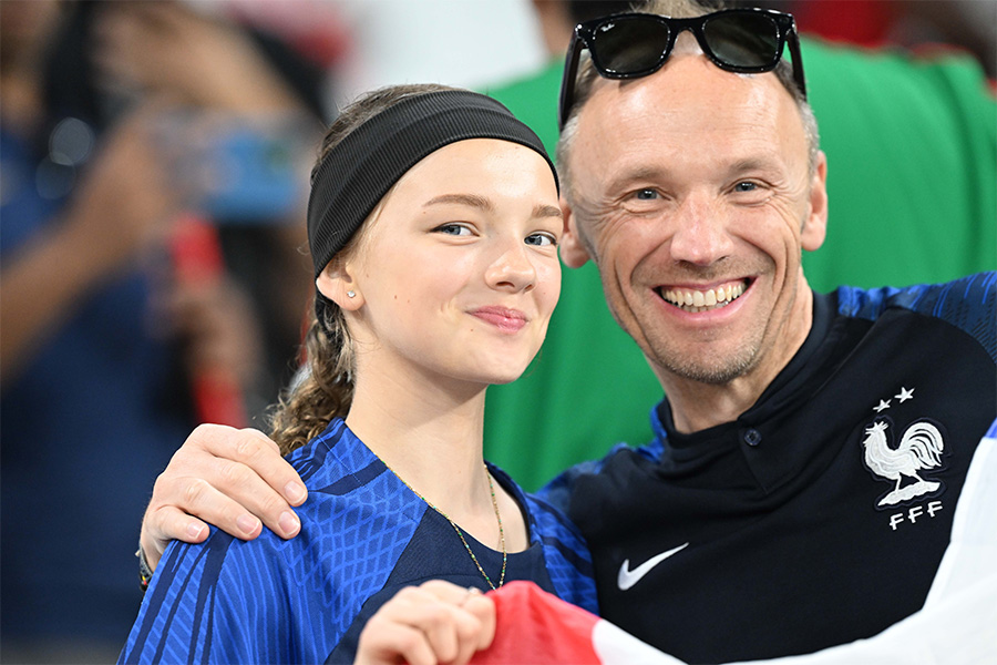 整った眉に耳にはアクセントのピアス。そのはにかみ笑いが眩しいフランスサポーターの少女。肩を組む右隣の男性は父親だと思われるが、若くしてW杯をライブ観戦できるなんて実に羨ましい。