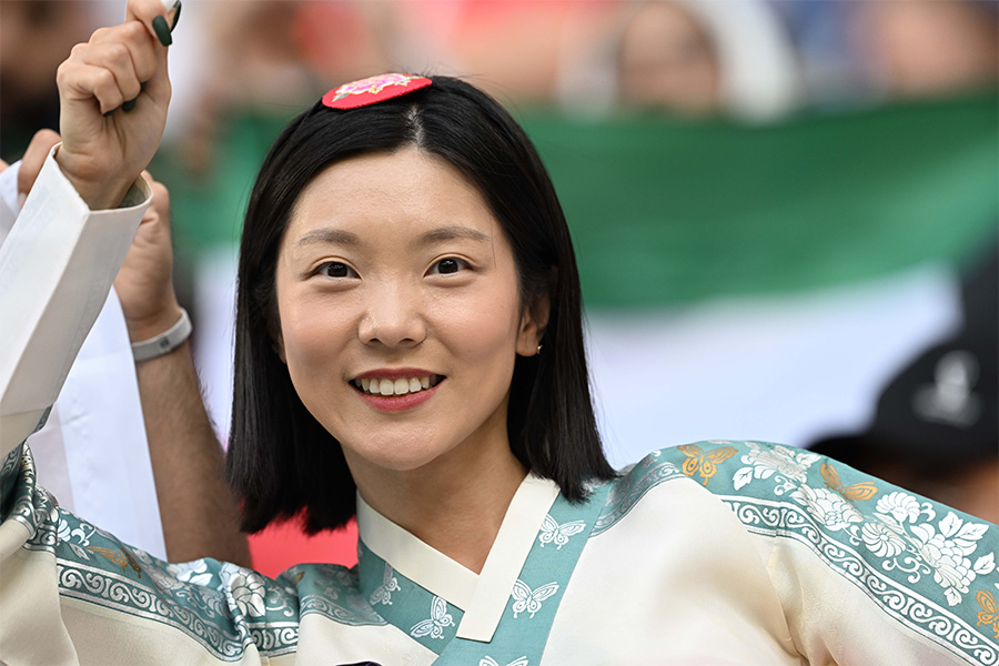 中東勢の活躍が目立つ今大会だが、アジア勢としても存在感を発揮したいところ。民族衣装のチマチョゴリを身に纏う韓国サポーターの女性は、多くの人々が集うカタールの地にあっても目を引いた。