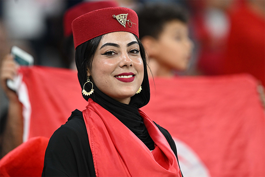 チュニジアサポーターの一団にカメラを向けると、気品ある笑顔を見せてくれた女性。深紅のマットタイプのグロスと帽子が黒髪を引き立てる。漆黒の衣装にも国旗を巻き付けて色のコントラストを強調している。