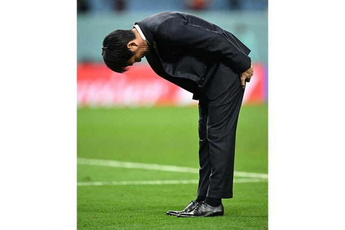 【写真】カタールW杯敗退後、スタンドのファン・サポーターに感謝の1人お辞儀を見せた森保監督